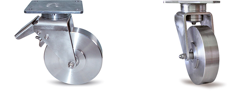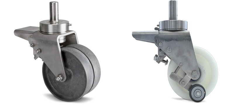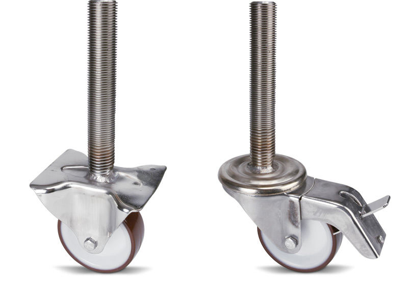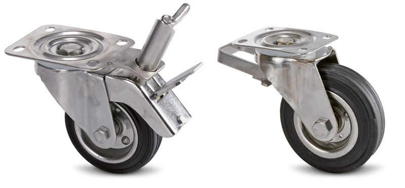 mit Labyrinthdichtungen im Schwenklager und elektrisch leitfähigen Rädern als Doppelrolle oder mit massivem Polyamidrad für sehr hohe Tragkraft und gefederter Rolle zur Ableitung statischer Elektrizität.