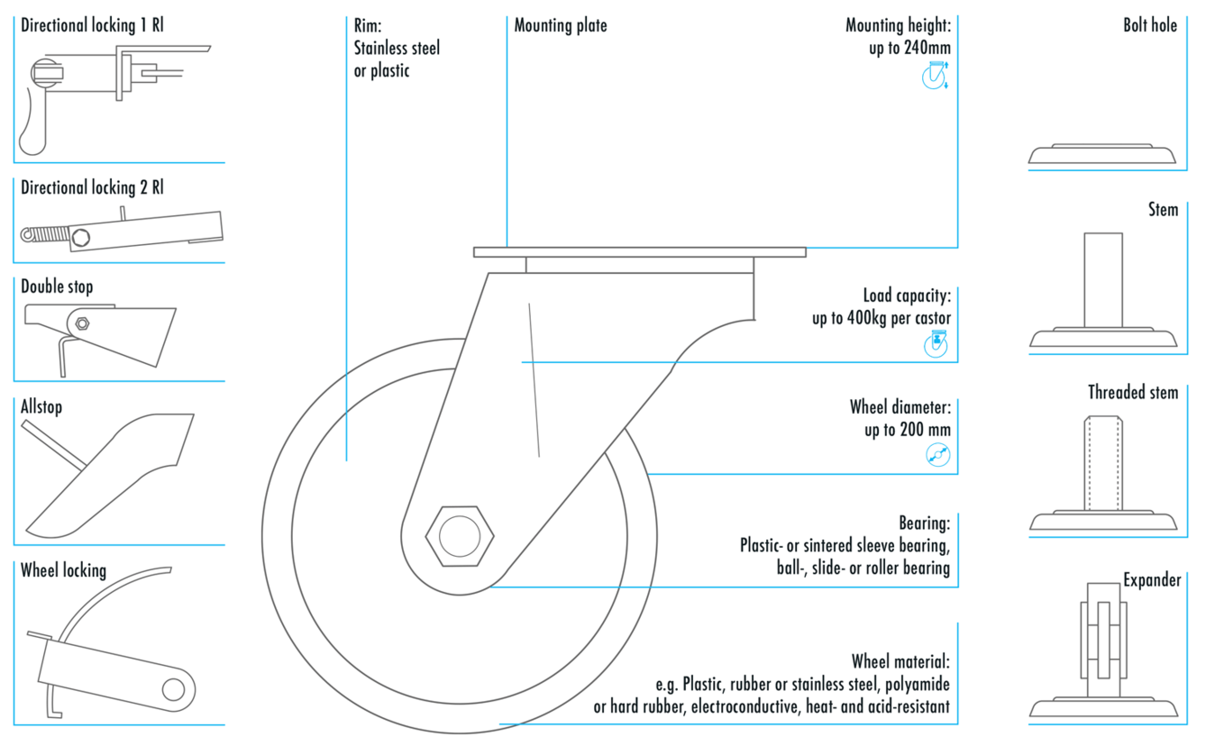 FWS castors are personal developments in all of the components, which can be combined appropriately according to your wishes. Alternatives are combinable for various requirements, for transport equipment- as well as apparatus castors.